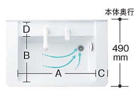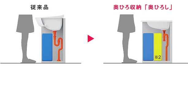 水がコーナーの排水口へまっしぐらに流れる設計。泡や髪の毛をスイスイすべるように押し流すので、使うたびにキレイに。お手入れもラクラクです。 タオルなどぬらしたくない物を置く「ドライエリア」と、一段低い位置にコップや石けんなどぬれた物を置く「セミウェットエリア」の、2つのエリアを設けました。