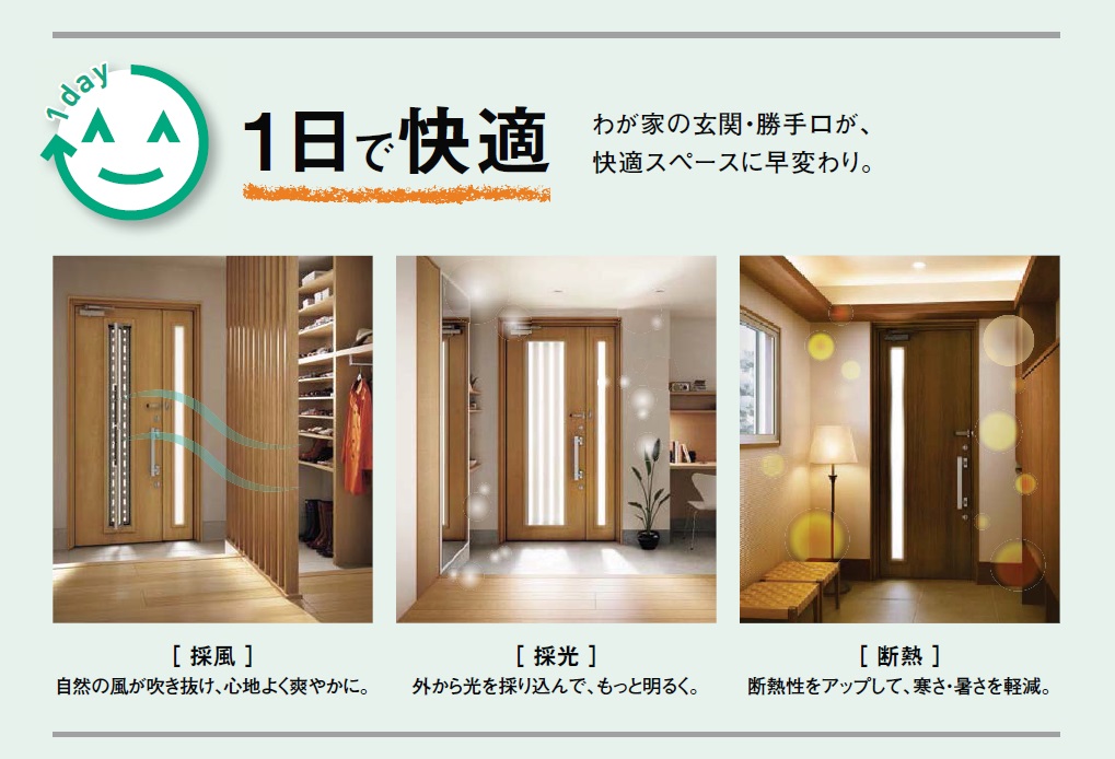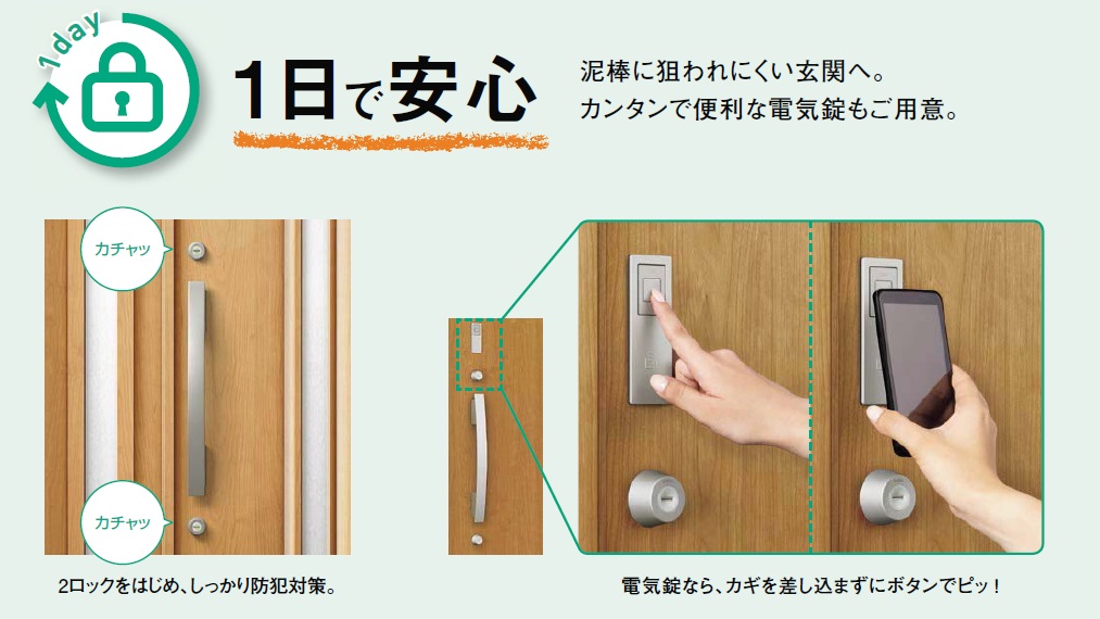 一日で施工。エコでありながら、冬は暖かく、夏は涼しく。 優れた断熱性能で、夏涼しく、冬暖かく、冷房効果がアップするので、 節約にもつながります。 ボタンを押すだけのタッチキー。 車のキーみたいな便利さ。鍵を携帯しているだけで、施錠も開錠も1アクション。帰宅時も、外出時も、ボタンをタッチするだけ。オートロックの設定にもできるので、鍵の閉め忘れも安心です。 ※価格帯は目安です。
