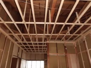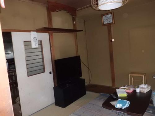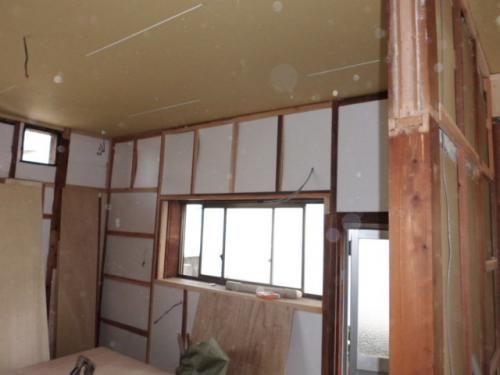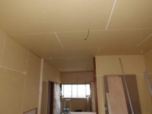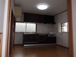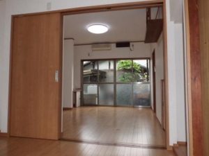 お客様の要望は居間と台所をつなげて1部屋にしたいとのことでした。と仏壇置き場も考えてほしいとのことでいろいろ計画しましたが、台所と居間との境に3本引き込み戸をつけることにより夏場は続き部屋にして解放、冬は閉めることにより暖房効果を高められるということでこのようにしました。