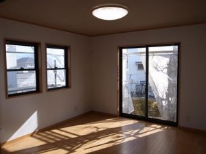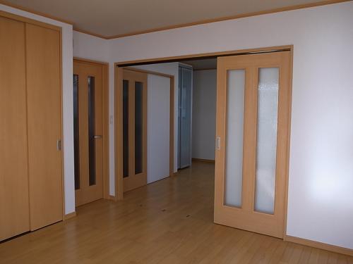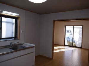 明るく広くなった居間と、つながりの良いDKです。 境の建具は2枚片引き戸とし、一体感を感じられる様に工夫しました。