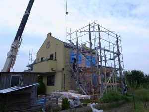 増築部基礎工事→足場組立→増築側既存屋根、壁解体→増築接合準備加工→建て方→屋根、外装工事→内部工事(既存部分補修)→足場撤去