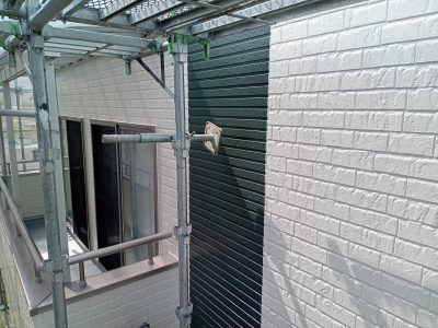 外壁は白色の下塗り材を塗装し中塗り作業をしています。