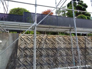 道路が狭いうえに 奥では道路工事が行われておりダンプの出入りが多い為、植木の伐採と、フェンス工事を行うとき安全の為、外部足場及び落下防止の為手摺をつけ 工事は無事完成しました。
