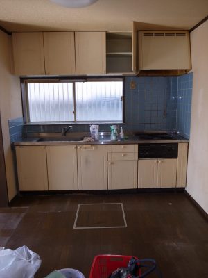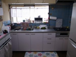 中古住宅のキッチン入れ替えリフォーム工事です。タイル壁及び吊り戸棚は既存のままで 下部のワークシステムと換気扇の入れ替えリフォーム工事です。 須々木