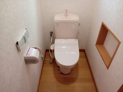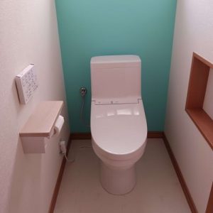 お疲れさまです。 都留市にてトイレの交換工事を実施しました。 ウォシュレットなどの調子が良くないとの事で交換させていただきました。 天井・床・壁なども張り替えてTOTOのトイレを設置しました。 アクセント壁が印象的です。 毎日使用するものだからキレイでいたいものです。 三浦